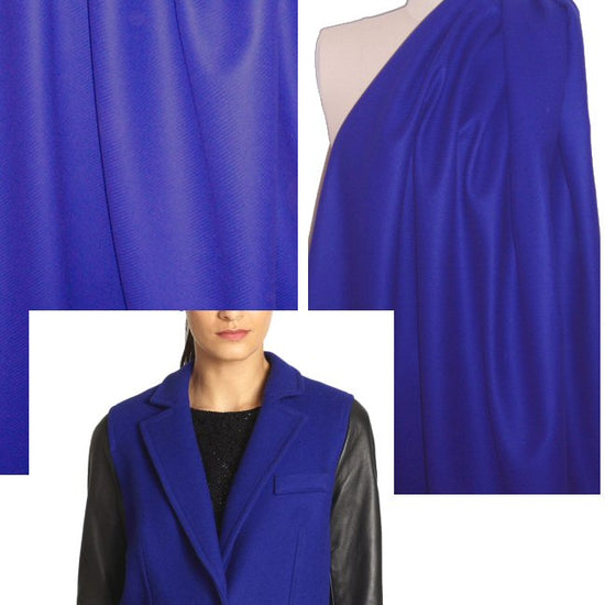 This is a stunning Italian doubleface wool/cashmere blend coating from Milly, with a subtle twill weave, in a brilliant royal purple-blue (PANTONE 19-3850 is close). It's quite thick with a more firm drape, and was used by the designer in the coat pictured below (sleeves are leather or faux leather). Make a distinctive coat or jacket that you will treasure for years! Dry cleaning recommended.