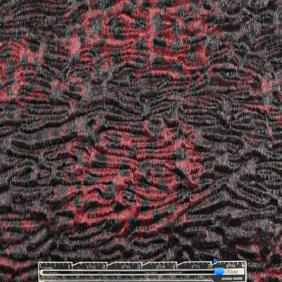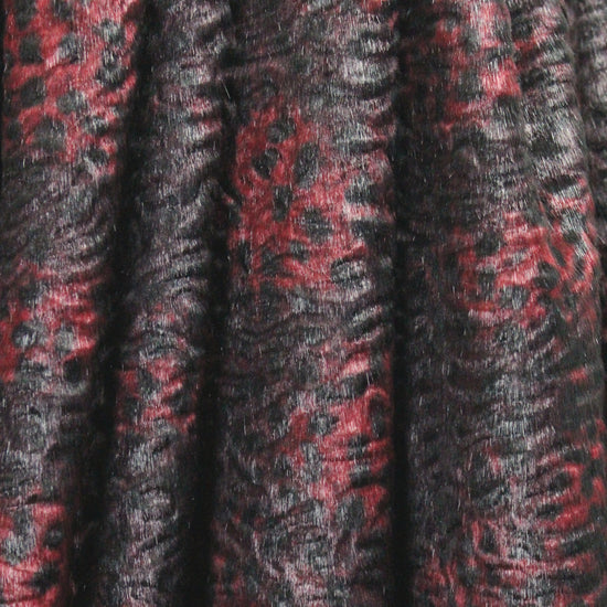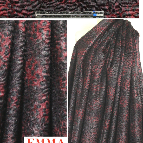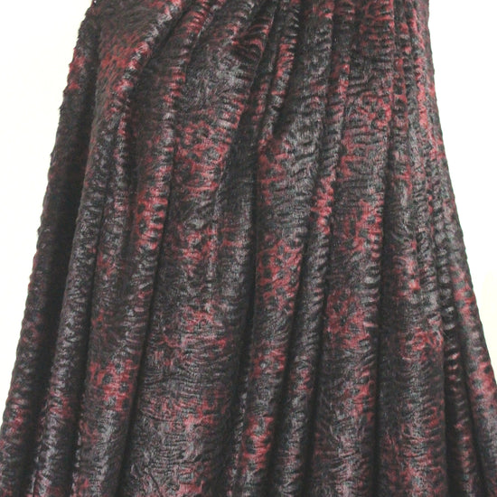 This is a wonderfully silky soft printed faux Persian lamb from Tah@ri, with a soft sheen and a wonderful sculpted texture. It is medium weight with a soft drape and a knit backing that gives it about 15% widthwise stretch. The base color is a burgundy and it is overprinted with a chic animal print in tinted black (PANTONE 19-1726, 19-3903). Perfect for a coat, jacket, cape, wrap, throw (line with satin or silk), or use as trim on a coat or jacket. Dry cleaning recommended. 1 yard.