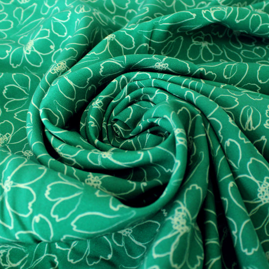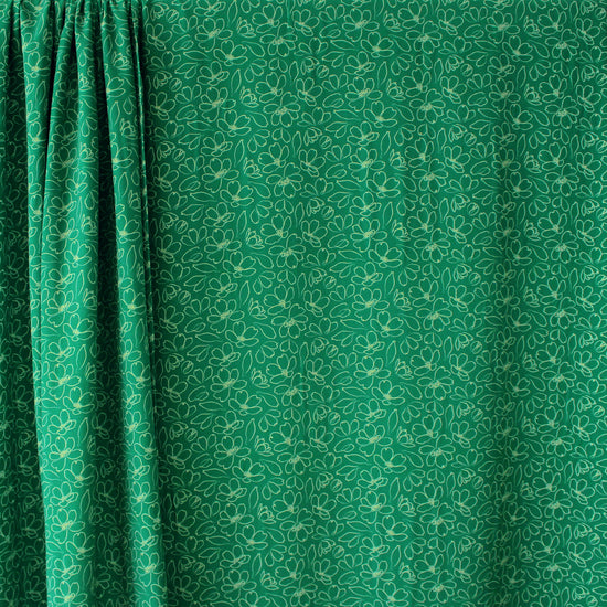 From a Dutch manufacturer specializing in high-quality sustainable fabrics, this is a gorgeous viscose woven, printed with a playful and cheery design. It is opaque with a soft drape and no stretch. The fun "daisy line" print features a sage floral linework pattern on an ivy green background. It has a vertical repeat of about 3.5". It is Oeko-Tex certified for non-toxic chemicals and dyes. Make a lovely top, tunic, dress, skirt, even pants or coordinates. Machine wash cool and lay flat or hang to dry. Do not bleach and iron on low.