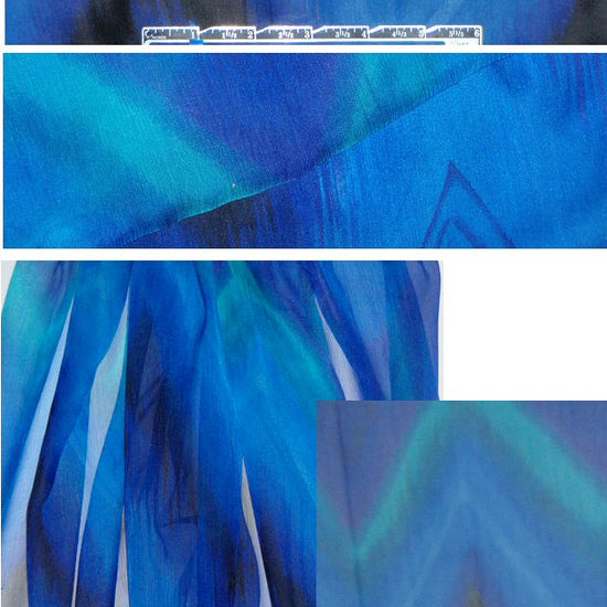This is a stunning crinkle silk chiffon print from the sample room of a young California designer, a featherweight, floaty and sheer textured silk featuring an oversized chevron print (approx 25" repeat) in the most beautiful blue and indigo tones with a bit of aqua (PANTONE 19-3955 is the central tone). Best for a scarf, billowy top or blouse, etc. Should be layered, scrunched or lined to best show the beautiful coloring, as it is very sheer. Dry clean or test first if you wish to hand wash at home. 1.375 yds.