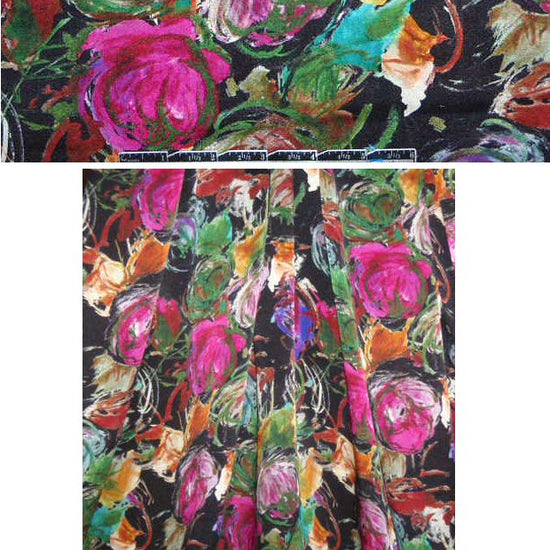 From Italy, this is a stunning printed blouse-weight satin chiffon (semi-sheer with a very tight weave, lightweight, with floaty drape and a beautiful surface sheen). It features a wonderful floral design in beautiful jewel tones on a black background. Amazing quality, fantastic design! Perfect for a billowy blouse, top, tunic, scarf, etc. Dry clean, or test first if you wish to wash at home.