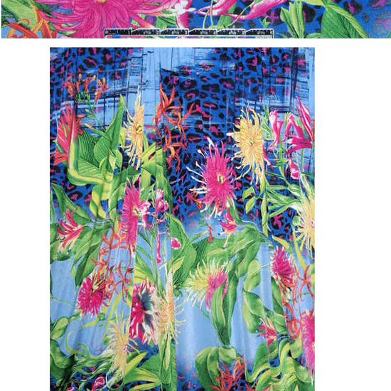 A bold and "beachy" poly/lycra knit knit with about 30% widthwise stretch, very lightweight yet opaque, with liquid drape. The print has a 35" repeat, and is a tropical floral fantasy montage with a watery background and a bit of animal print, and the vibrant colors include periwinkle, hot pink, lemon, leafy greens, blue and black (PANTONE 16-4020, 19-4053, 18-2333, 12-0740, etc.). Machine wash warm, hang to dry, perfect for tops, tees, tunic, dress, maxi dress, beachwear, etc. LAST PIECE, .70 yds.