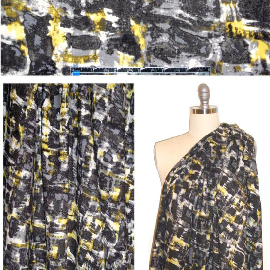 This Italian wool flannel from a NY designer is fabulous! It's a woven dressweight with a soft surface texture and a lovely, soft drape with a bit of body. The edgy abstract design features black, ivory medium gray and lemon (PANTONE 17-4402, 12-0752, etc.). Perfect for a dress, skirt, light jacket or substantial shirt, tunic, etc. Dry clean, or test first if you wish to hand wash. Lay flat or hang to dry.