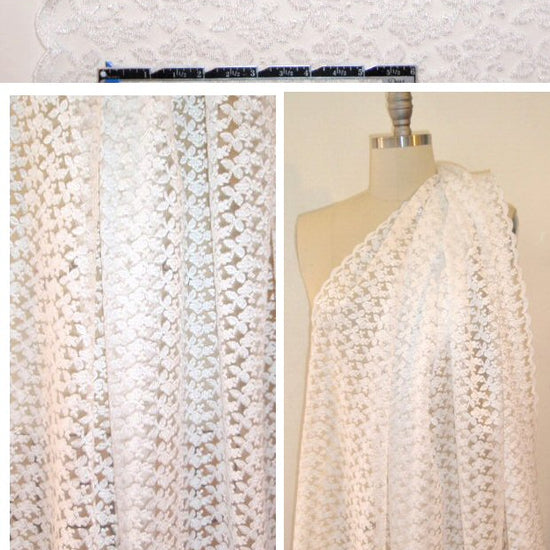 From a NY designer of eveningwear, this double scalloped lace is STUNNING! The white all-over flower motif is textured and dimensional on a sheer white mesh ground. Scalloped edges adorn each selvedge. This lace is photographed on a white background, as well as also on the dress form which shows the sheerness. Use for any project calling for guipure lace or any type of fancy, stable lace. Dry cleaning recommended. 1.66 yds.
