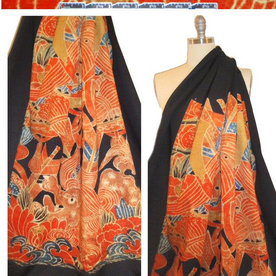 Just in with a new shipment from France and Italy, this amazing Italian panel print is striking and unique!! The fabric is a medium weight cotton woven, and each panel has a "dragon of the deep" illustration in a colorful array including orange, blue, gold, black, loden, etc. (PANTONE 16-1452, 14-1041, 18-4232, 18-0420, etc.). Best for a jacket, vest, skirt, sheath dress, etc. Please test first if you wish to hand wash, and hang to dry.