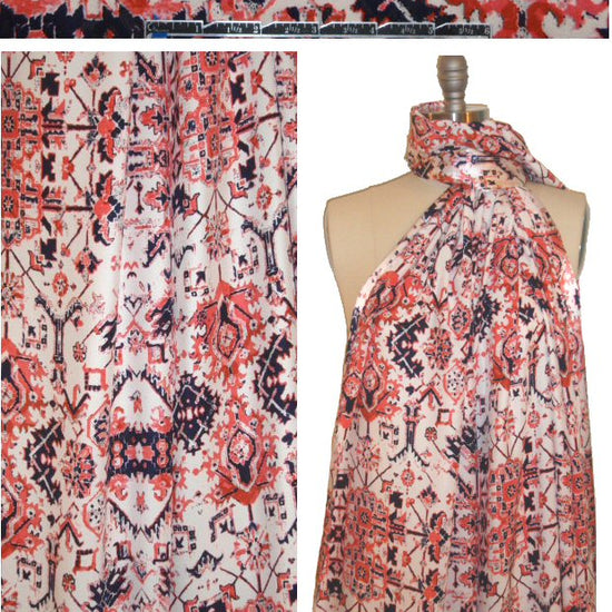 From a NY designer, this is a gorgeous silk charmeuse, substantial with a luxurious drape and beautiful sheen, and with a wonderful persian rug-inspired print (22" repeat) that is equally saturated on both sides, so it is reversible! The colors are navy, coral and white (PANTONE 19-4025, 16-1632, etc.). Perfect for a blouse, top, or tunic, dress or skirt. Also a great luxury lining for a jacket or coat. Dry clean, or test first if you wish to wash at home.