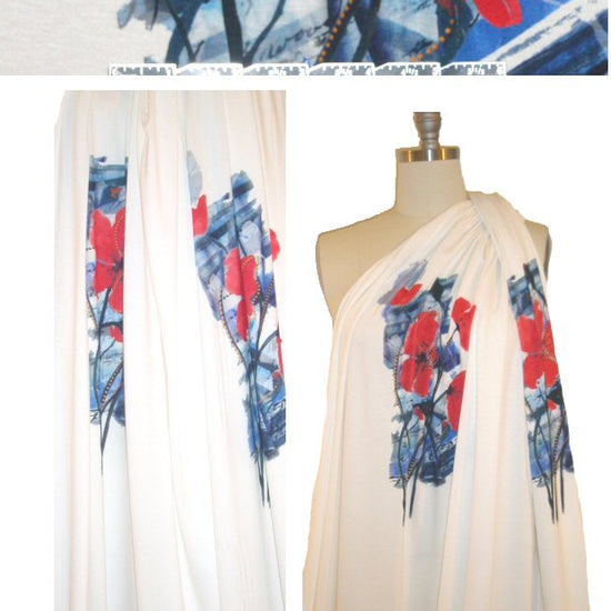 My supplier had more these fabulously popular knit panels from Italy, so I'm able to offer them again! This is a great viscose/lycra knit, light weight with lots of drape and about 60% stretch in the width, 45% in the length. The background color is creamy white, and the "studded"-looking flower emblem print features cherry and denim blues (PANTONE 18-1660, 16-4120, etc). There are two 30" wide panels across the width. Great for tees, tops, tunics, etc. Test first if you would like to hand or machine wash, cold, hang to dry. 1 yard.
