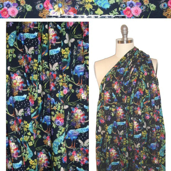Here's another AMAZING cotton/lycra print imported from The Netherlands, to knock your EmmaOneSocks off! First, the quality of the fabric is sublime, soft and substantial, with about 40% stretch in both directions. It is opaque and has a luscious hand and drape with body. The digital "peacocks and butterflies" print (9.5" repeat) features peacocks, butterflies and flowery clusters in tones of black, green, goldenrod, pink, red, turquoise, aqua, etc. (PANTONE 14-0123, 13-0746, 17-1930, 19-3850, etc.). Make a fabulous tee, top, tunic, kidswear, skirt, dress, loungewear, etc. The manufacturer recommends hand or machine wash warm, hang to dry. Please test first. LAST PIECE, 1.125 yds.