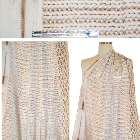This fantastic conversational lightweight silk woven print from a NY designer is nearly opaque with a soft drape. The weight similar to charmeuse but with a matte finish. The 'knit-purl-zip' print, in beige, mocha and cream (PANTONE 12-0605, 17-1321, etc.), has a 3" border of photorealistic zippers along one selvage, a cenrtal area of magnified knit stitch, and a 10" border along the other selvage of super-magnified purl stitch. Please note that the fabric itself is a silk WOVEN---it is just the print that mimics the look of a knit! Manipulate the different areas to create any number of fun and creative garments! You can mix and match directions, but the drape seems just a tad stiffer across the grain. Perfect for a blouse, tunic, fun lining for a lightweight jacket, skirt, dress, etc. Dry clean or please test first if you wish to hand wash, and hang to dry. LAST PIECE, 1.125 yds.