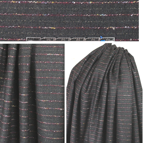 This beautiful Italian wool twill from Tah@ri is classic and sophisticated with a novelty yarn stripe that adds color, interest and dimension. The base fabric is an charcoal-toned medium suiting weight, and the horizontal design alternates pinkish-burgundy, gold and light blue boucle'-ish stripes with sparkly light gold metallic dashy stripes (PANTONE 18-0000, 18-1716, etc.). It has a soft drape with some body, and the stripes can be oriented in either direction. Perfect for a tailored jacket, dress, skirt, pants, etc. Dry cleaning recommended.