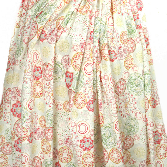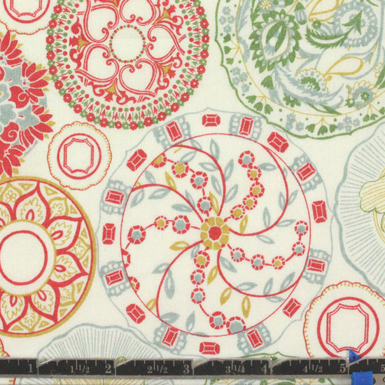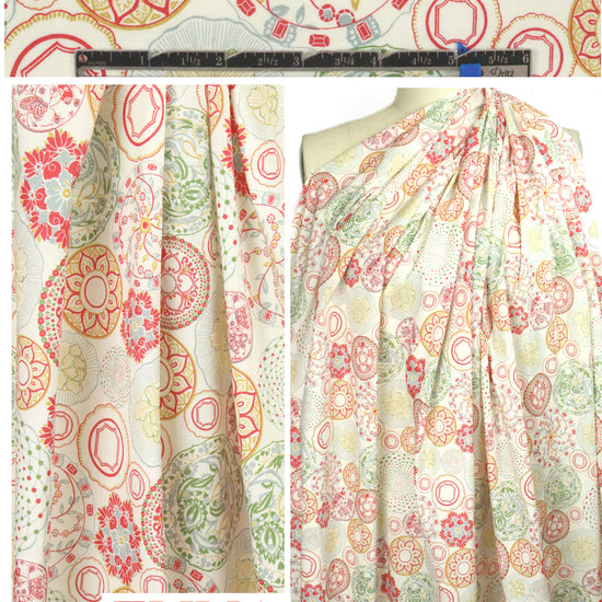 From the seasonal collection of Liberty Art Fabrics, this is a Tana lawn weight cotton print, imported from England. The print is a decorative medallion graphic (12.5" repeat) in tones of rouge, fern, dijon, natural and celadon gray (PANTONE 17-1927, 14-0837, 17-0119, 15-4706, etc.). The cloth is an exquisite quality cotton lawn, lightweight, semi-opaque, soft with cottony drape, and the print has much more clarity and beauty in real life. For blouses, shirts, dresses, skirts, etc! Hand wash cold, hang to dry (please test first). This was purchased through a designer, not directly from Liberty--hence the lower price!. LAST PIECE, 1 yard.