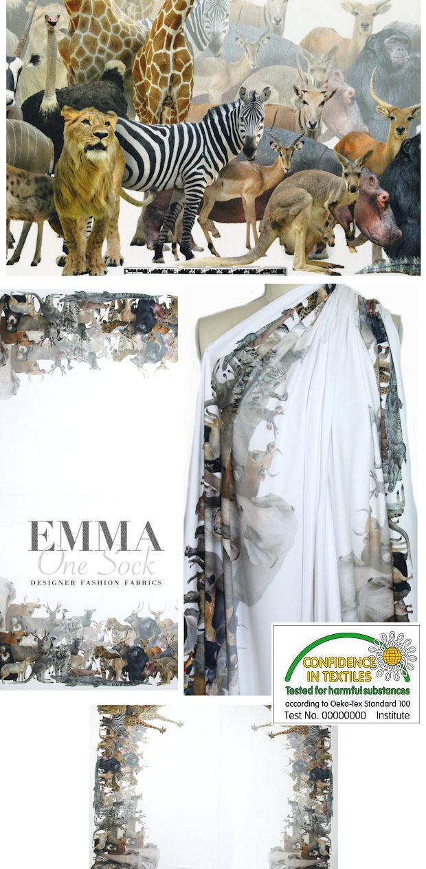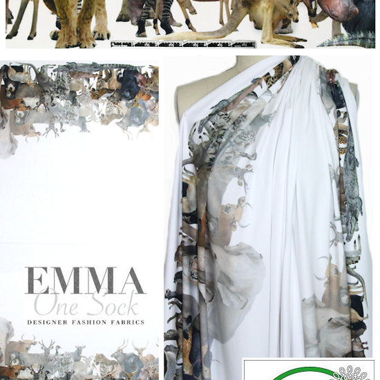 Here's another amazing cotton/lycra print imported from The Netherlands! First, the quality of the fabric is sublime, soft and substantial, with about 40% stretch in both directions. It is opaque and has a luscious hand and drape with body. The digital "African plains" double border print features a gorgeous animal kingdom array that goes along each selvage, in realistic colors on a white background. The animal area goes as much as 19" (giraffes) in towards the center of the fabric from each selvage. The vertical repeat is 63.5" long. The white area in the center is approximately 16" wide. Make a fabulous tee, top, tunic, skirt, dress, loungewear, childrens clothing, etc. The manufacturer recommends hand or machine wash warm, hang to dry. Please test first. 1.375 yds.