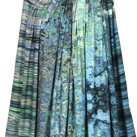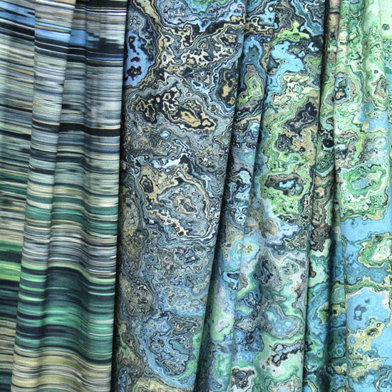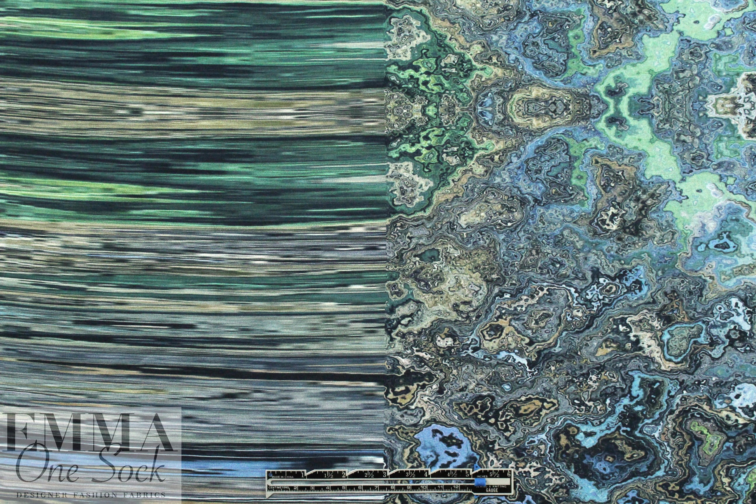Here's another fabulous cotton/lycra print imported from The Netherlands! First, the quality of the fabric is sublime, soft and substantial, with 40% stretch in both directions. It is opaque and has a luscious hand and drape with body. The double border digital fimo swirl print is striking and vivid, with stripey selvage borders measuring about 10" each, and geode-like fimo swirls in the middle section. The design has a 59" vertical repeat. The main colors are shades of aqua, teal, blue, green, gray, etc. (PANTONE 13-0111, 18-4217, 18-4711, 16-1105, etc.). It's perfect a fabulous tee, top, tunic, skirt, dress, etc. The manufacturer recommends hand or machine wash warm, hang to dry. Please test first. END OF ROLL, 1.5 yds.
