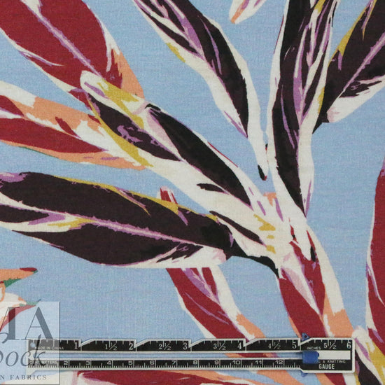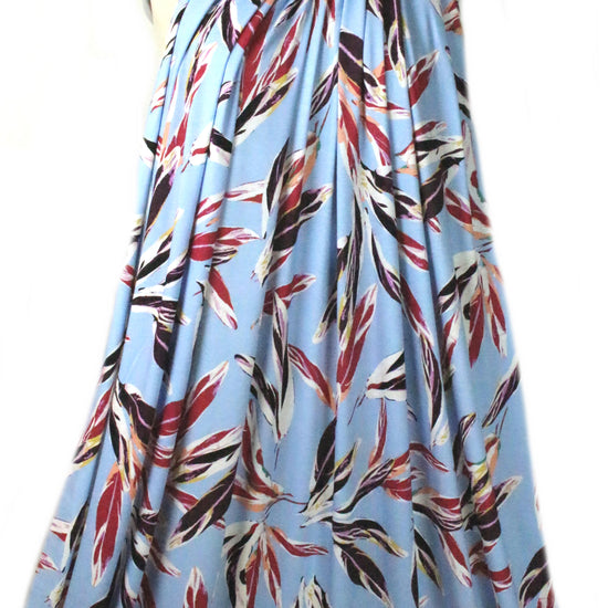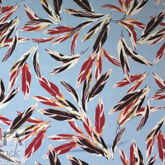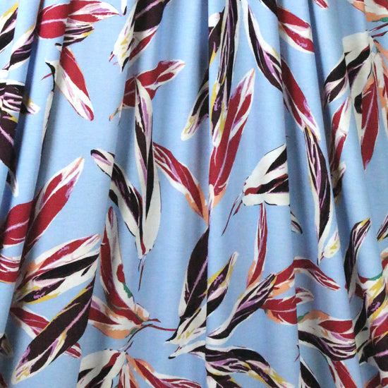 From a German mill, this is a lovely viscose/spandex 4-way stretch knit, lightweight yet opaque, with lovely drape. The fantastic "plumage" print (24" vertical repeat) features a beautiful blend of colors including brick, aubergine, mustard, ecru, wisteria and apricot blush on a light soft blue ground (PANTONE 15-3920, 18-1633, 13-1029, 19-2814, etc.). 60% stretch in the width, 30% in the length, with great recovery. Great for tees, tops, tunics, dresses, etc. Beautiful quality! Hand wash or machine wash gentle, inside out, and hang to dry.