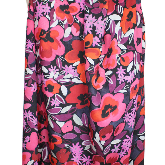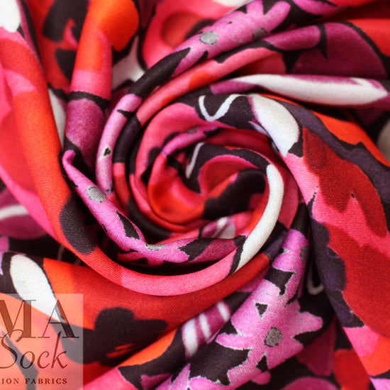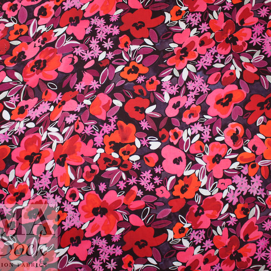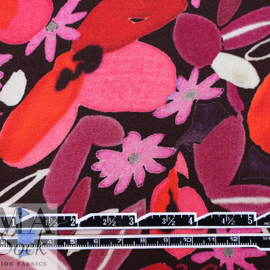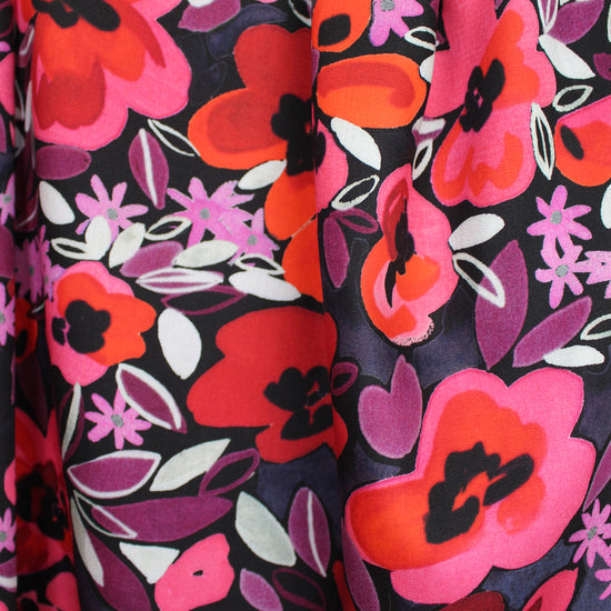 This is a wonderful Italian viscose micro-twill woven from a designer, lightweight and opaque with a soft drape and a more dressy finish. The sweetheart floral design (24" repeat) features shades of red, coral pink, cyclamen, soft plum, pearly white, etc. on a black background (PANTONE 18-2525, 17-2033, 19-1663, 16-3118, 18-1559, etc.). Perfect for a shirt, blouse, tunic, top, dress, skirt, etc! Dry clean, or try hand wash, hang to dry (please test first). .75 yds.