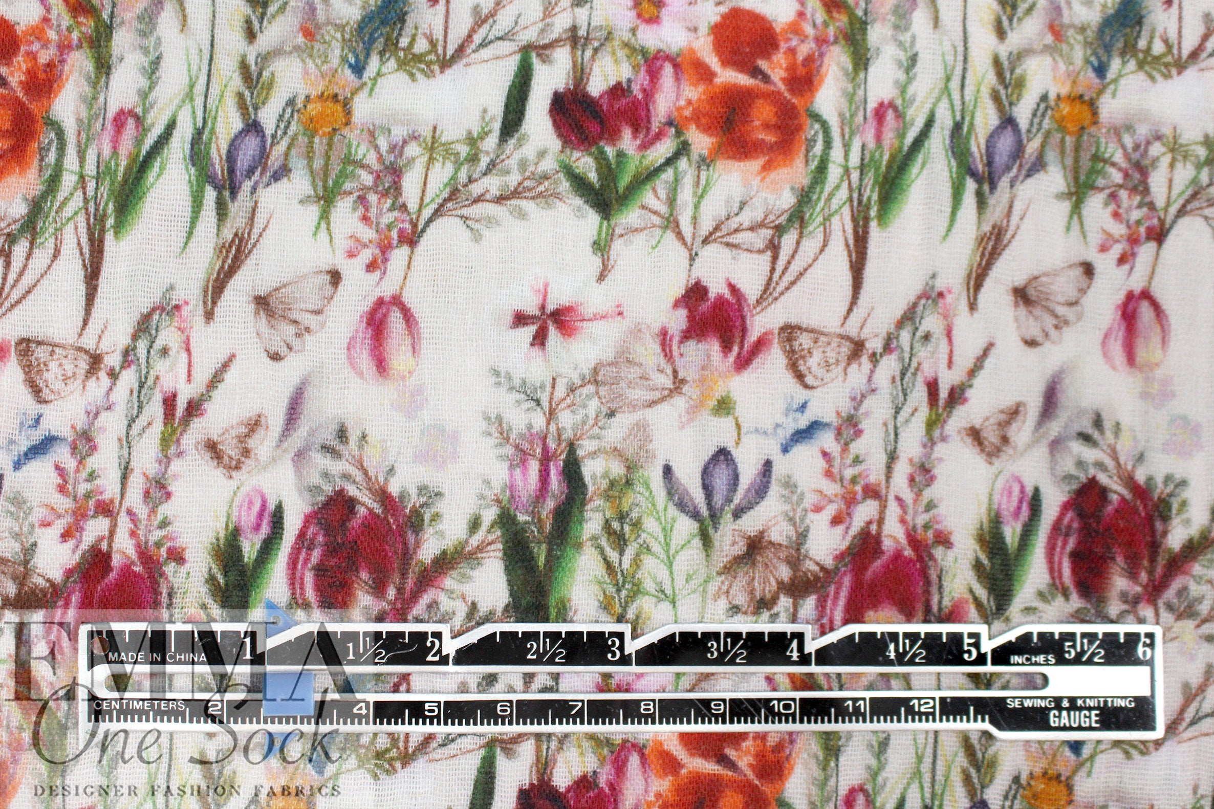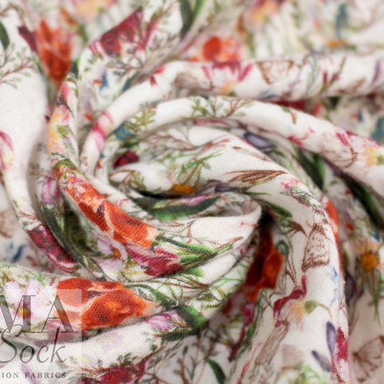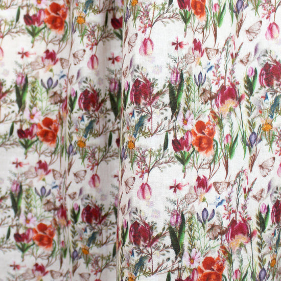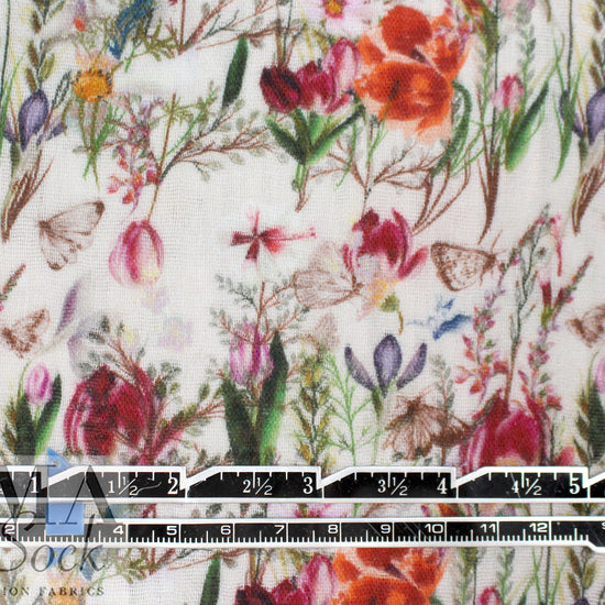 This beautiful fabric is a soft and airy cotton double (2-ply) gauze called "mouseline". It is medium-light weight, nearly opaque with a bit of body in the drape, and the two layers sewn together provide a very slight puffiness and weightlessness. The delightful "garden dream" print (4" repeat) features cranberry, forest, aubergine, plum brown, carmen red, etc. on a soft white background (PANTONE 11-0701 is close to the background, 19-1840, 19-0419, 18-1550, 18-3513, etc.). It is perfect for a casual shirt, top, tunic, blouse, beach cover-up, kids clothing, etc. Hand or machine wash cold, gentle, hang or lay flat to dry (please test first!), or dry clean. 1.375 yds.