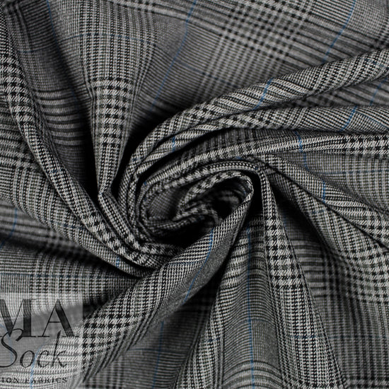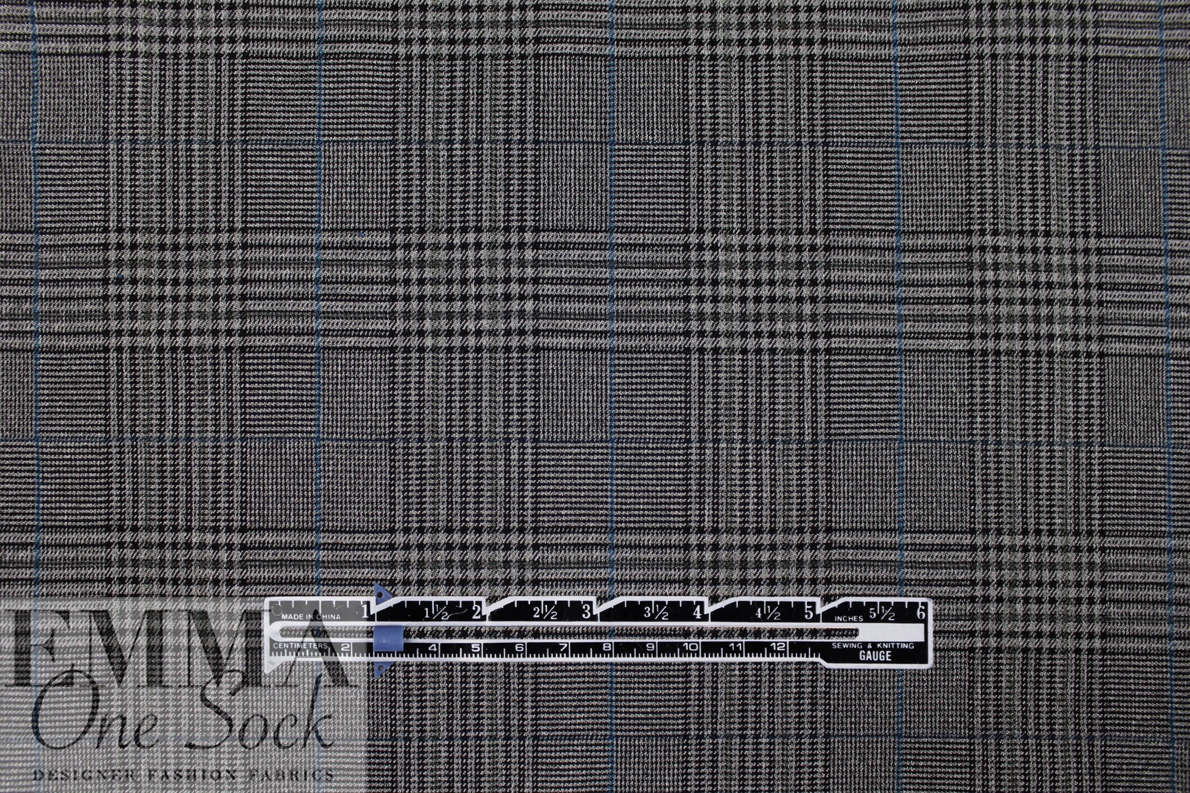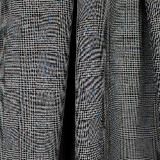 This timeless rayon blend bengaline has the same yarn-dyed glen plaid pattern on both sides. It is medium weight and opaque with some crispness and body in the drape. As a bengaline, this fabric has about 20% stretch lengthwise only, so your garment pattern would be laid across the width. The colors are charcoal gray and black, with a thin blue stripe (PANTONE 15-0000, 19-4340, etc.). Perfect for stretch trousers, fitted jacket, skirt, sheath dress, stretch jeans, etc. Machine wash cold and hang to dry, or dry clean. Iron on low. 1 yard.