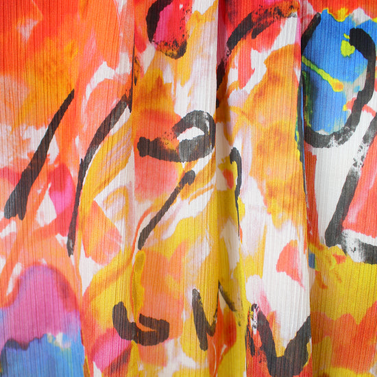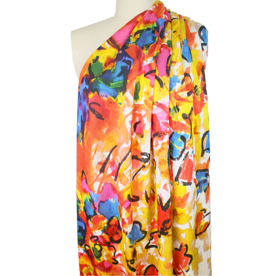 Such an exquisite fabric! From French designer deadstock, this silk/cotton pliss�-textured woven is lightweight with vertical ribs (the reverse is not meant to be seen). The gorgeous and colorful 'painted floral' print (30.5" repeat) features marigold, tangerine, ultramarine, sky blue, black, pink, etc. on a soft white base (PANTONE 17-1558, 18-4244, 19-3850, 14-0756, 16-1349, 11-0602, etc.), and it is vivid and rich. Please note that the flowers disperse and thin out towards one selvage, so it should be treated more like a border print or panel print. It is semi-opaque with a bit of body in the drape, and there is about 20% "give" in the width only with great recovery. Make a beautiful blouse, top, tunic, dress, etc. Dry cleaning recommended. 1.5 yds.