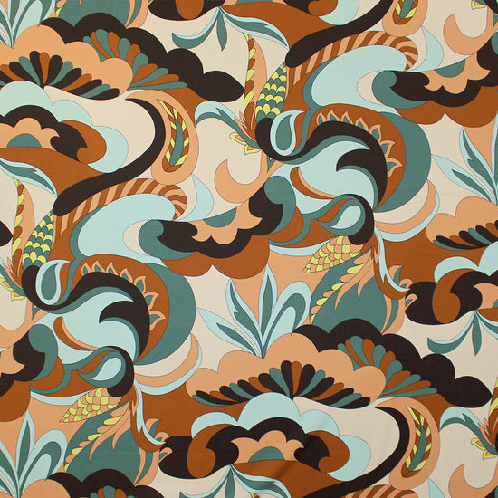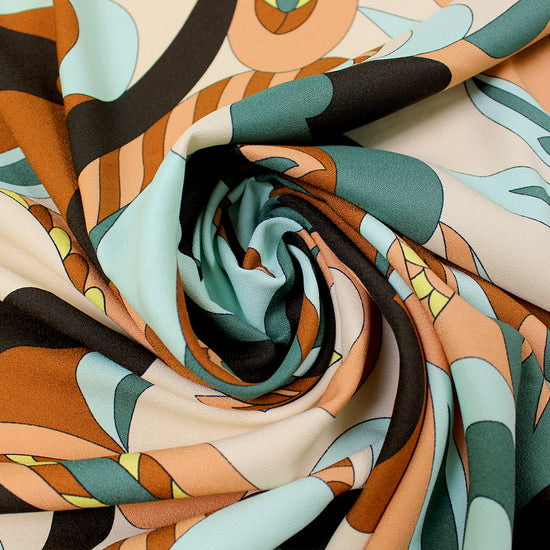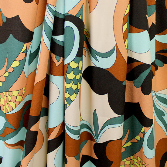 From French designer deadstock, this is a fabulous print on a medium-light weight and opaque polyester pebble crepe woven that beautifully mimics the qualities of a light silk crepe. It has a subtle finely pebbled texture and matte finish with a beautiful drape. The 'Pucc!-esque landscape' design (32" repeat) features a swirling scene in robin's egg green, hazelnut, apricot, blue spruce, buttercup, shell pink, black coffee, etc. (PANTONE 13-5911, 18-1230, 16-1340, 18-5611, 13-0746, 12-1106, etc.). Perfect for a blouse, top, tunic, dress, skirt, etc. Some styles may need lining or layering. Please test first if you wish to hand wash and hang to dry, or dry clean. 1.25 yds.