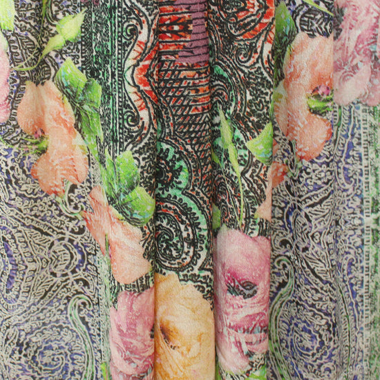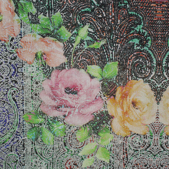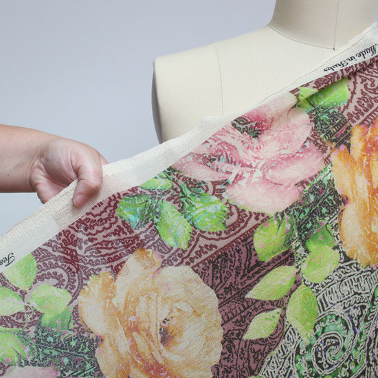 From very limited designer deadstock and made in Italy, this is a unique and absolutely gorgeous light-weight 100% wool crepe woven with a panel print that has a 54" wide by 44" long repeat (the second image shows one full cut panel). It is semi-opaque with a slightly open weave. The "heirloom rose" design features a tapestry like printed background and heirloom roses in shades of pink and yellow. Make a stunning dress, shirt, blouse, pajamas, etc. There are endless design possibilities for a creative sewist! Hand wash, testing first, or dry clean.