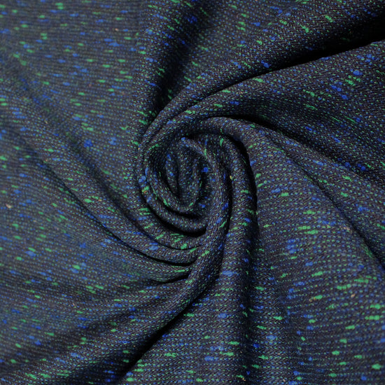 From designer deadstock and made in Italy, this is a very special, textured woven in a lighter suiting or coating weight. The design features an irregular mix of cobalt and emerald yarns, with a micro-dash that runs widthwise with the occasional slub that creates a pop of color. With its midnight blue background, this is an ultra sophisticated way to wear color. The warp is black and the weft combines midnight blue, cobalt and emerald, creating an overall impression from a distance of a dark blue. It is soft and comfortable, not at all dense but opaque with body in the drape. Make a stunning lined or unlined jacket, suit, overshirt, trousers, structured dress or skirt, etc. Dry cleaning is recommended.