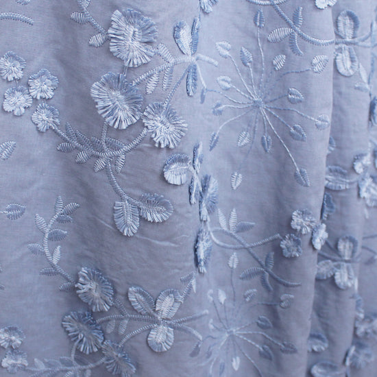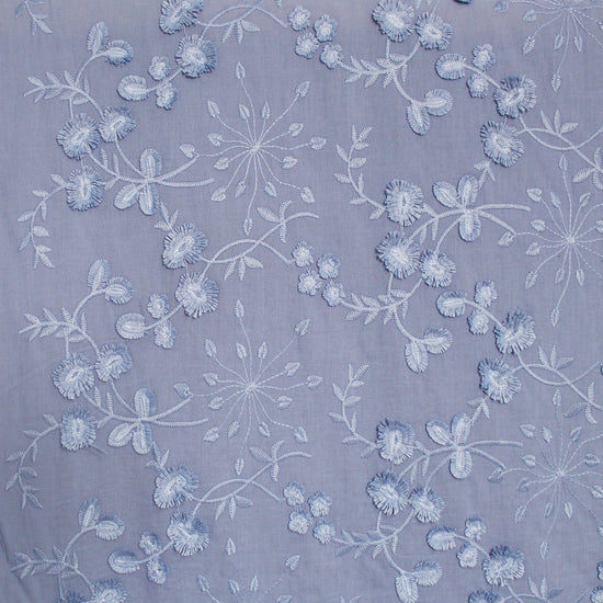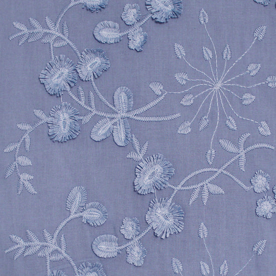 From a Dutch manufacturer specializing in high-quality sustainable fabrics, this is a very unique, dimensionally embroidered cotton woven. The base fabric is a lightweight 100% cotton voile, and the embroidery adds a bit of firmness to the drape. It is nearly opaque and stable in both directions. The wonderfully textural, embroidered "zinnia" design has a vertical repeat of about 6.375". The cotton and embroidery are a soft dusky blue. It is Oeko-Tex certified for non-toxic chemicals and dyes. Make an incredible shirt, tunic, dress or skirt, etc. Machine wash gentle or hand wash cool and lay flat or hang to dry. Do not bleach and iron on low.