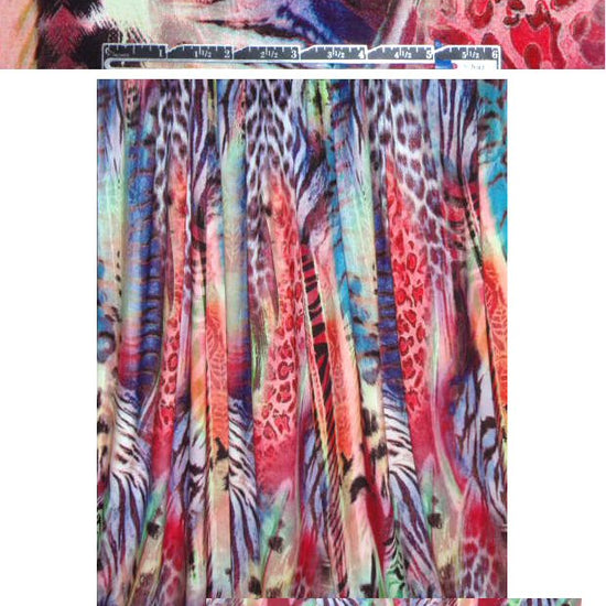 This is a lovely quality 4-way stretch rayon/lycra knit (30% in the width, 20% in the length), opaque yet very lightweight with wonderful drape and a "dry" (not slippery) hand. The print is a "snazzy" animal print montage with a 33" repeat in rouge, turquoise, indigo, black, light mint, cobalt, etc. (PANTONE 18-1755, 17-4433, 12-0225, etc.). Make any number of tops, tees, tunic, dress, skirt, etc. Strategic placement of the pattern will result in a truly unique garment! The manufacturer recommends machine wash warm and tumble dry low, no bleach. LAST PIECE, 1.75 yds.