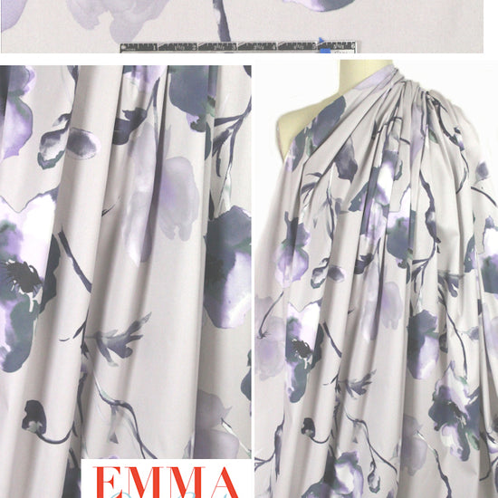 From a new shipment that just arrived from Italy, this is a wonderful cotton/spandex 2-way stretch twill woven (20% widthwise stretch). It is printed with a painterly floral (24.5" repeat) in shades of soft purple with some tinted dark gray and leafy green, etc. (PANTONE 16-3815, 17-3922, 13-3804, 17-6323, etc.) and the medium weight is perfect for summery skinny jeans, fitted jacket, sheath dress, fitted skirt, etc. It is opaque with body in the drape. Please test first if you wish to hand or machine wash, and hang to dry.