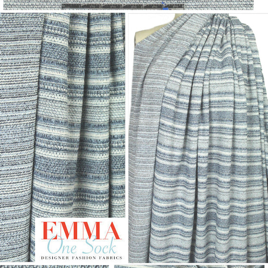 This is a fantastic all-cotton sweater knit made in Italy, a medium-weight and nearly-opaque knit with a varied stitch stripe (2.75" repeat) in denimy blue, bleached blue and natural (PANTONE 19-4025, 14-4210, etc.). It has a soft drape and about 40% stretch widthwise, 20% lengthwise, and is perfect for a tunic, cardigan, pullover, sweater dress, etc. The reverse, shown in the drapey photos below, is more of a tweedy knit stitch, and could be used as the face, or for contrast. Casual, comfortable and stylish! Cut in a single layer layout; as with most natural fiber sweater knits, there can be some twisting and/or distortion (we give extra to compensate for this). Dry clean, or hand wash, lay flat to dry.