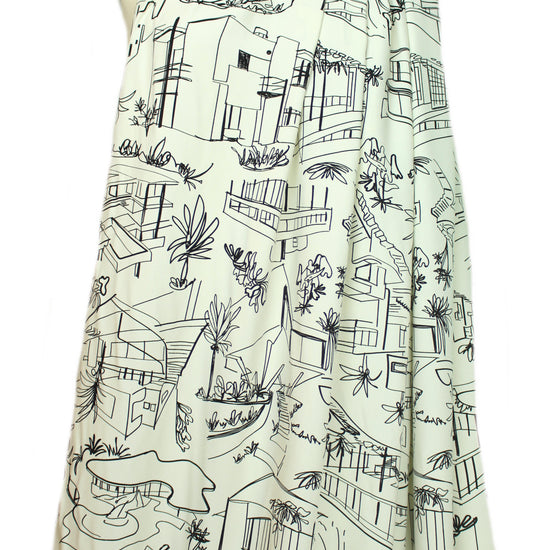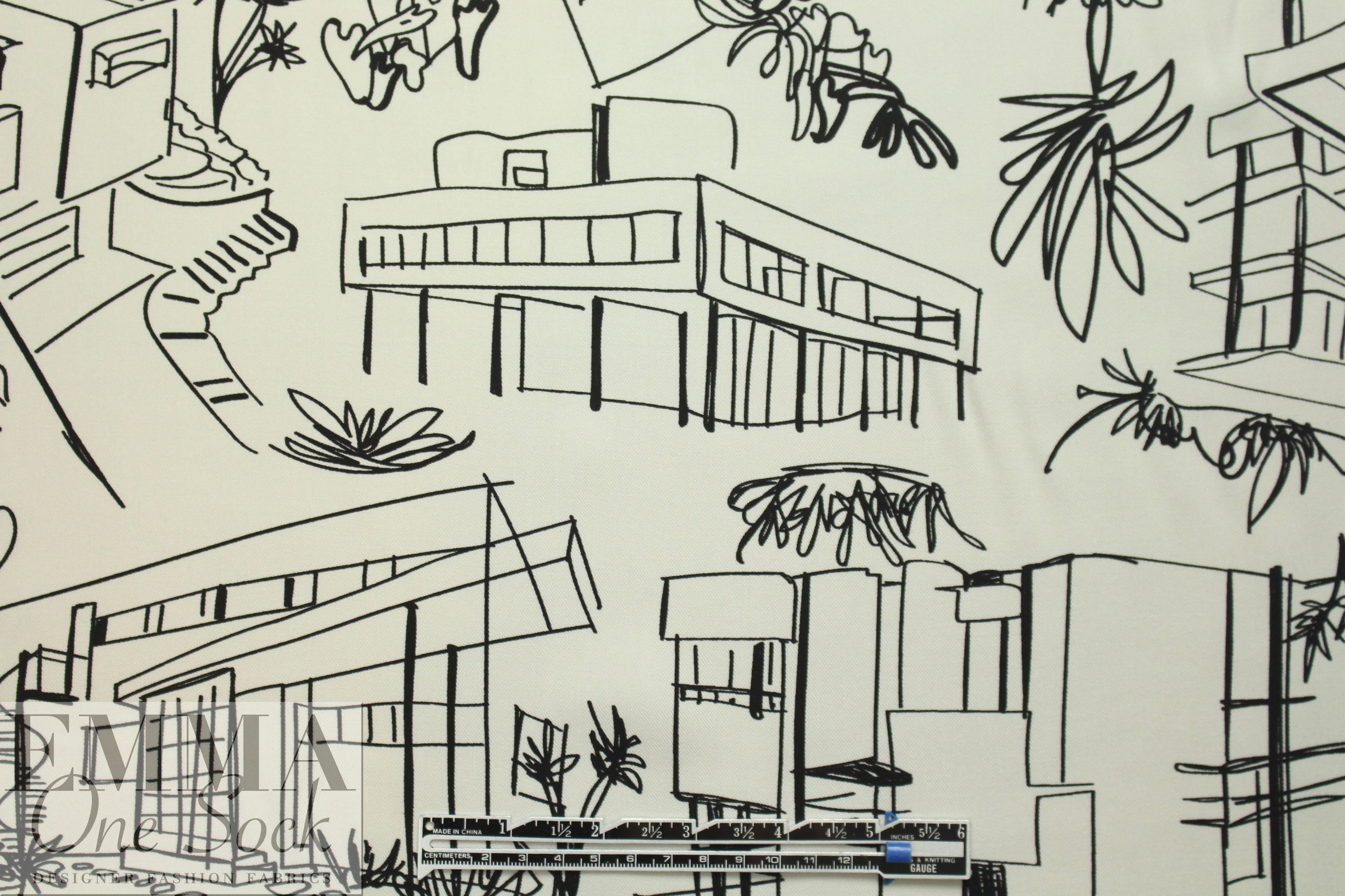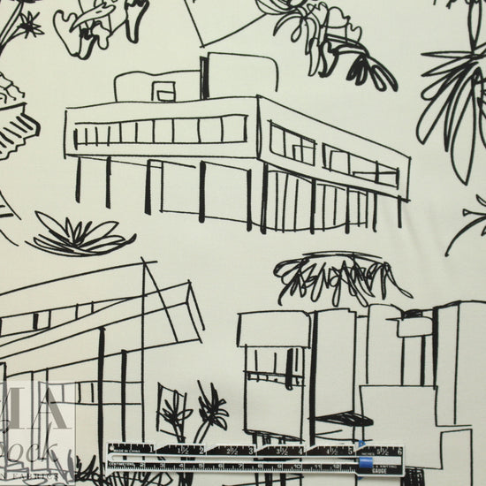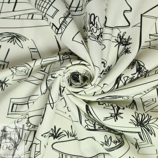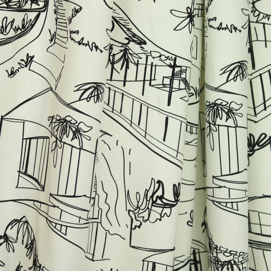 This is a lovely quality rayon twill, lightweight yet opaque, drapey and soft, with a versatile 'luxury homes' print in ivory and black. It is perfect for a blouse, shirt, top, tunic, dress or skirt, etc. Dry clean or hand- or machine wash gentle and hang to dry. 1.25 yds.