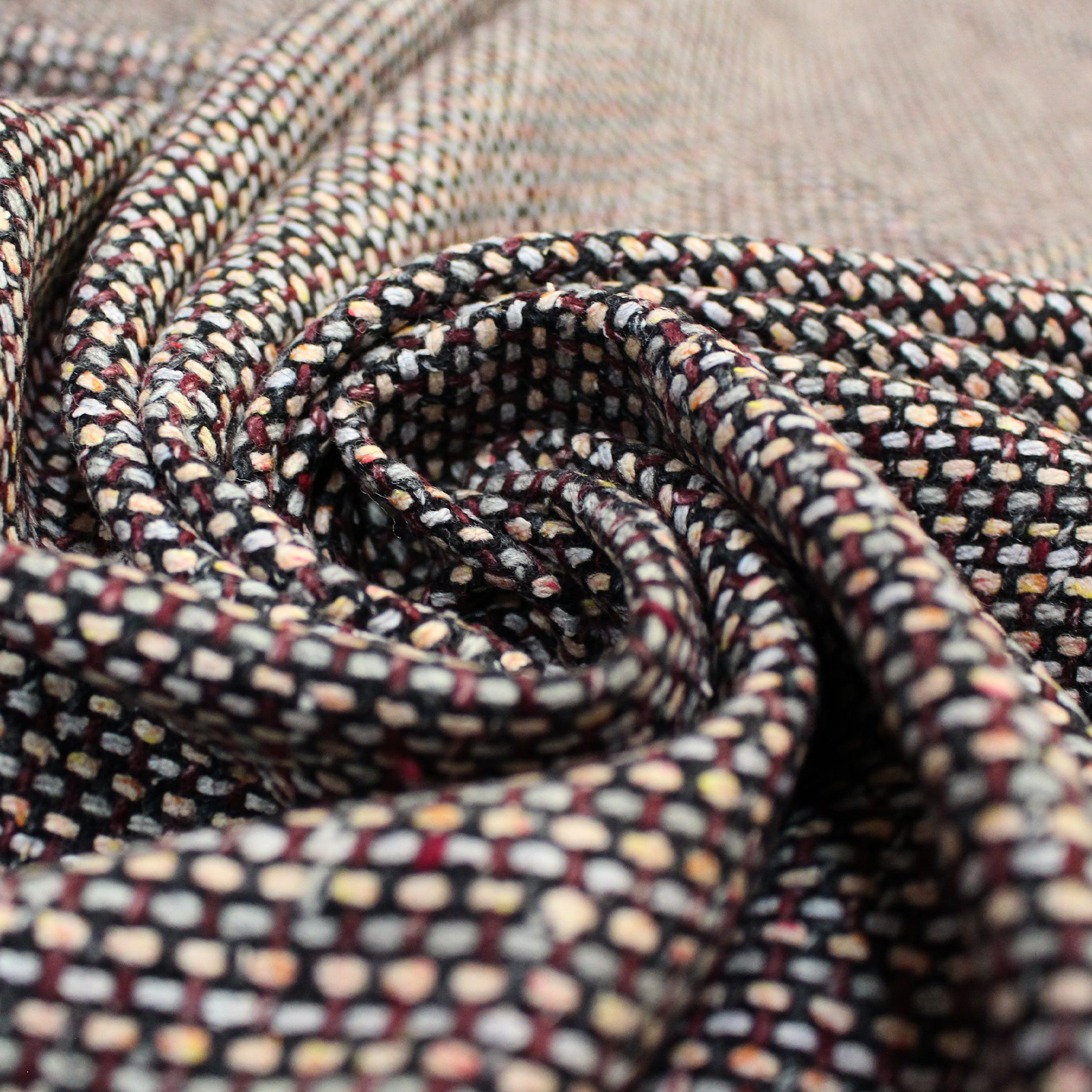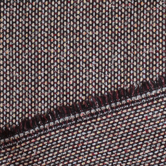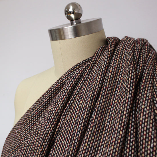 From designer deadstock and made in Italy, this is a beautiful quality, tweedy suiting with an interesting weave. The fibers are a blend of wool, cotton and polyester, and the yarns are woven in a small-scale basketweave (.25" repeat) lending to its excellent texture. It is a mid-weight suiting weight with substance, and opaque but not at all dense. At first glance, it is an auburn earthtone. Look closer to find a very pretty range of soft gray, peachy pink, deep wine and soft black tones. Make a classic Chanel-style jacket, suit, dress or skirt, lined coat, etc. Dry cleaning is recommended.