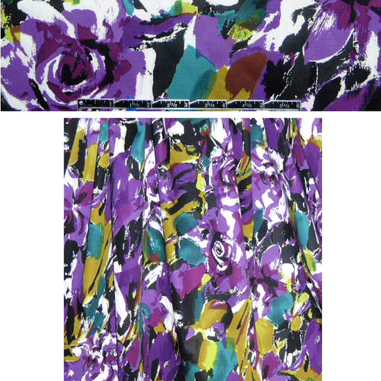 This is a gorgeous cotton/lycra woven print from ODL, a stretch sateen dress/bottom/jacket weight with a smooth surface texture and just a bit of stretch in the width only. It's medium-weight, opaque, and features a lovely floral design in violet, shades of teal, olive, light spring green, black and white (PANTONE 19-3526, 18-5618, 13-0645, etc.). Perfect for spring/summer dresses, skirt, lightweight jacket, capris, etc. Test first if you wish to wash at home. LAST PIECE, 2 yds.