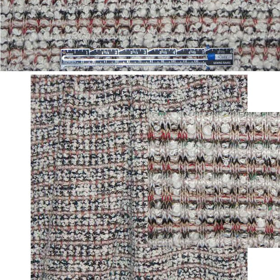 This is a fantastic wool blend chunky sweater knit boucle' just in with new Italian shipment. It has a thick and loopy textured surface created by weaving curly winter white yarns through a knit backing, so it has a flatter knit look on the back, still with some "nubs". The backing knit is variegated, so the colors morph from one to the other for a rich and varied coloring, but they are chiefly brick, loden, taupe and off-black, in addition to the winter white (PANTONE 11-4301, 19-1759, 18-0322, etc.). It has a sweatery, cozy look with 20% stretch in the width only. Lots of body, thick and warm. Make a cozy, chunky cardigan, sweater jacket or coat, poncho, wrap, etc. Dry clean, or if you wish to try hand-washing at home please test first, and lay flat to dry.