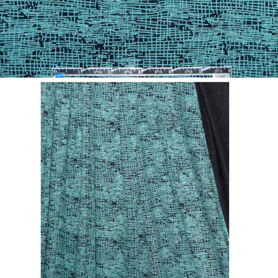 This is a lovely quality 4-way stretch rayon/lycra knit (30% in the width, 20% in the length), opaque yet lightweight with wonderful drape and a "dry" (not slippery) hand. The print is a very cool crosshatch design in turquoise (PANTONE 16-5123), printed on a black knit base. Make any number of drapey tops, tees, tunic, dress, skirt, etc. The manufacturer recommends machine wash warm and tumble dry low, no bleach. 1.25 yds.