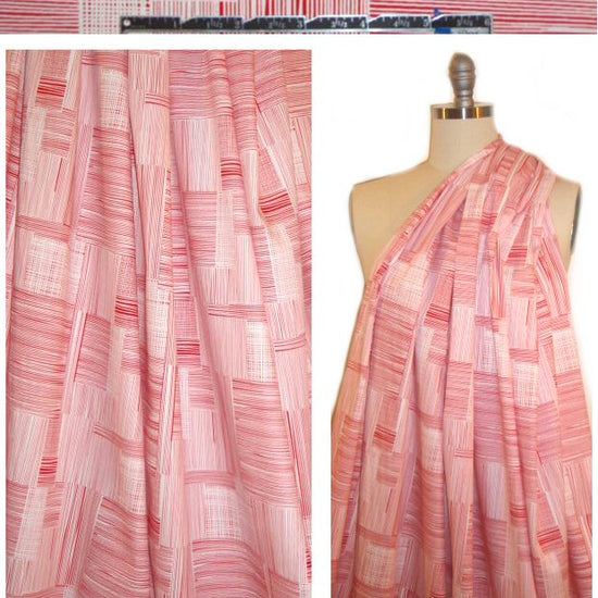 This is a fabulous cotton/lycra woven with about 15% widthwise stretch, a cottony dress/pants weight with a very dry hand and smooth surface texture. It's medium-weight, opaque, with a cottony crisp drape. Fabulous "patch hatch" graphic (the print is much more clear and sharp and wonderful in real life) in red on white (PANTONE 18-1661). Perfect for a summery dress, skirt, capris or pants, jacket, etc. Hand or machine wash separately, cold, hang to dry.