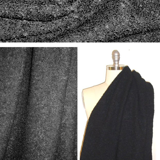 From a CA designer, made in Italy, this is a fabulous all wool boucle' woven, very textured and thick, with a less textured back. It is stable in both directions, quite substantial and opaque with body in the drape. The color is black. Perfect for a boucle' jacket or coat, cape, etc. Dry clean only. LAST PIECE, 1 yard.
