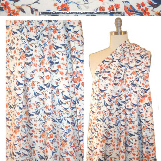 This is a lovely quality drapey viscose-rayon woven, lightweight, nearly opaque, with lots of drape. The fabulous "backyard birdies" print features tones of cadet blue, dark navy, tangerine, pale gray and off white (PANTONE 19-4050, 16-1361, 14-4002, etc.). Make a fabulous drapey blouse, top, tunic, dress, skirt, etc. The manufacturer recommends hand or machine wash, hang to dry, medium iron. LAST PIECE, 1 yard.