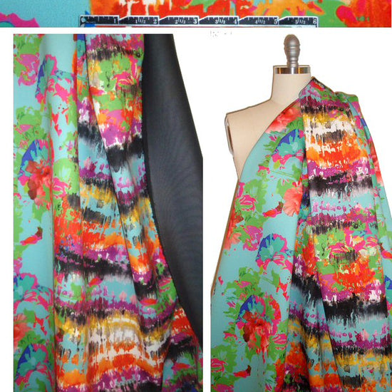 This "Scuba" knit (aka "neoprene") from a NY designer and made in Italy is substantial in weight with a micro-doubleknit construction, a smooth texture and lots of body in the drape. It is backed with a very thin black woven for comfort and stability. It has only about 5% stretch in the width and you could easily orient the design in either direction on your garment. The fabulous rorschach floral border print (37" vertical repeat) features brilliant tones of robin's egg, hot pink, coral, lime, purple, violet, yellow, etc. (PANTONE 15-5209, 17-2127, 15-0146, 16-1542, etc.). Make a structured dress or jacket, pencil skirt, etc. Test first if you would like to hand or machine wash.