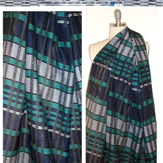 From a NY designer, this is an Italian 'slatted' weave fabric (meaning it has a pattern of solid textured areas with sheer slats of nylon), is a yarn-dyed dress/jacket weight, semi-sheer, with a more firm drape and a stripey pattern that has a 20" repeat. The colors are black, silvery white, jade and dark navy (PANTONE 15-5519, 19-3935, etc.) and it is perfect for a pretty dress, skirt or jacket that can be dressed up or down! Lining or layering may be needed. Dry cleaning is probably best. The silk content is minimal but it's there. Sells for $49.00/yd in retail fabric stores. LAST PIECE, 2 yds.
