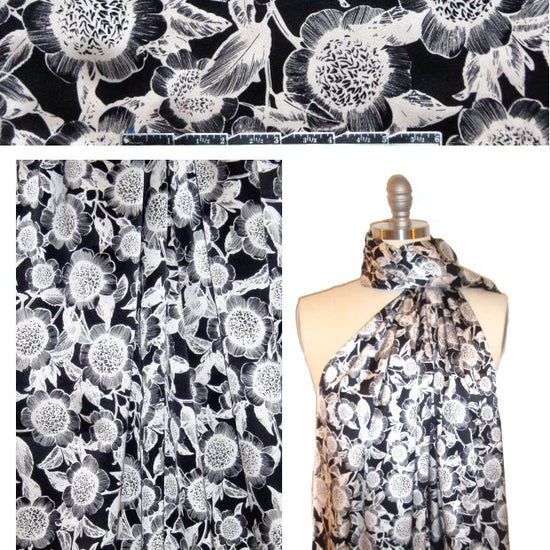 From a new silk supplier, this is a fabulous silk charmeuse with a lovely drape and beautiful sheen. The print is a beautiful black and white stylized floral. Perfect for a blouse, top, or tunic, dress, skirt, or a great luxury lining for a jacket or coat. Dry clean, or test first if you wish to hand wash and hang to dry.