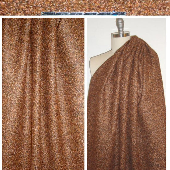 From a NY designer and made in Italy, this fabric is spectacular. It's similar to the yarn scramble fabrics that are created through a special felting process that adheres (without glue or fusing) the yarns to each other in a scrambled, tweedy design. The reverse is a flatter and more simple knit stitch. It is medium weight and stable in both directions, with a density that makes it cozy and warm. The colors are a tweedy mix of spice tones: nutmeg, cinnamon, curry, etc. with flecks of winter white (PANTONE 18-1030, 17-1330, 19-1015, etc.). More "firm" than drapey, although it's soft and malleable and has uniform thickness throughout. Perfect for an indoor or outdoor artsy jacket or coat, and it doesn't fray! Distinctive and beautiful with a rich coloring. Dry cleaning recommended. LAST PIECE, 1.375 yds.
