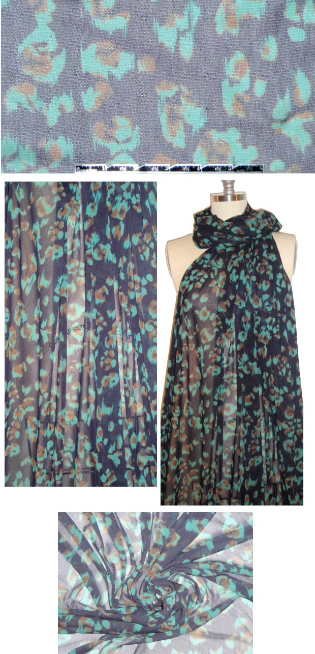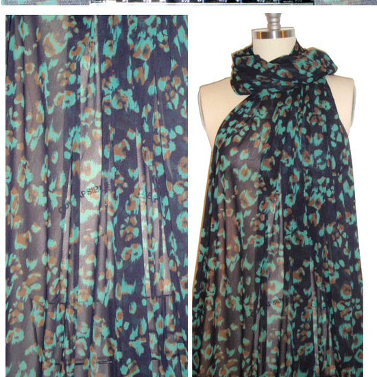 From a wonderful West Coast designer, this is a 4-way stretch mesh knit, with 150% widthwise, 30% lengthwise stretch. It is featherweight, semi-sheer and drapey with a micro-honeycomb texture. The print is a "camo cheetah" design in black, jade green and sienna brown (PANTONE 16-5721, 18-0933). Perfect as an overlay for tops, tunics, dresses, shawls, scarves, etc. and you can either double it or line it with power mesh to recreate your favorite RTW! Beautiful quality at a great price. Hand wash cold, hang to dry. .875 yds.