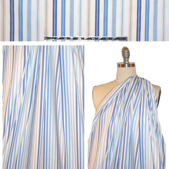 This is an excellent quality damask stripe cotton shirting, with alternating stripes in various shades of blue and light khaki on a white background (PANTONE 16-4020, 16-4031, 19-3955, 12-0605). It is a classic shirting weight with a very tight weave and a cottony-crisp drape, making it perfect for mens' or ladies' shirting, etc. Dry clean, or if you wish to hand or machine wash, please test first. Hand to dry.