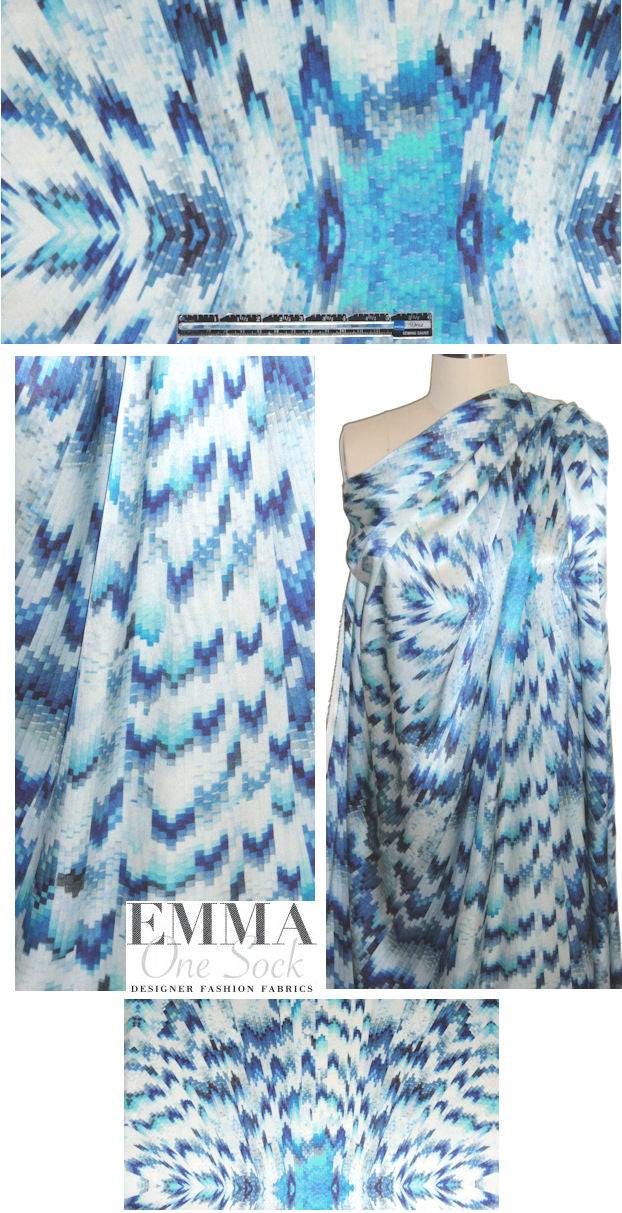 This stretch silk charmeuse print from a NY designer has about 10% widthwise stretch, a soft drape and a pleasing sheen. The amazing print is a mosaic design (79" repeat) in tones of turquoise, blue, navy and pearl (PANTONE 15-4722, 18-3945, 12-4608, etc.). Lightweight but opaque, and perfect for a blouse, top, tunic, dress, lining for a stretch woven jacket or coat, etc. Dry cleaning recommended, or if you wish to try hand-washing please test first. LAST PIECE, 1 yard.