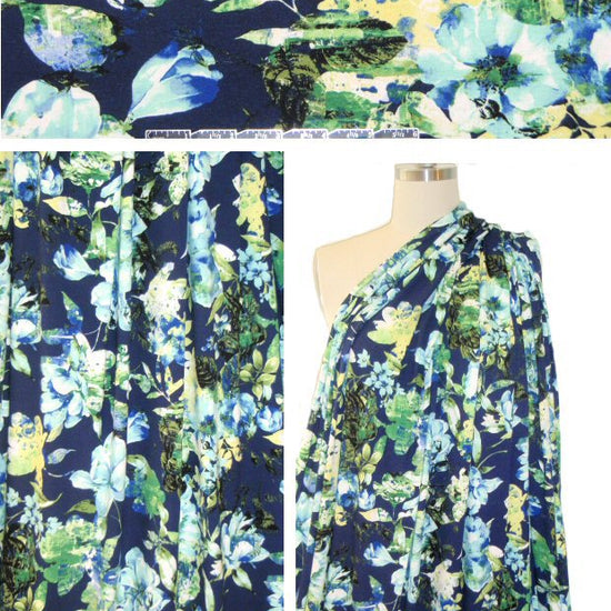 This is a lovely quality 4-way stretch rayon/lycra knit (900% stretch in the width, 50% in the length), opaque yet lightweight with wonderful drape and a "dry" (not slippery) hand. The print is a beautiful "floral overlay" design (24" repeat) in tones of navy, aqua, leavy greens, black, soft white, etc. (PANTONE 19-4014, 15-0336, 13-4909, etc.), perfect for any number of tops, tees, tunic, dress, skirt, etc. The manufacturer recommends hand wash or machine, dry on low, no bleach. 1.875 yds.