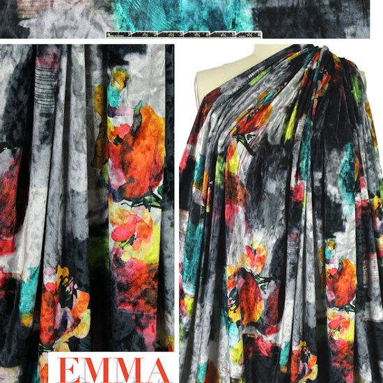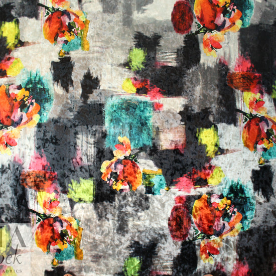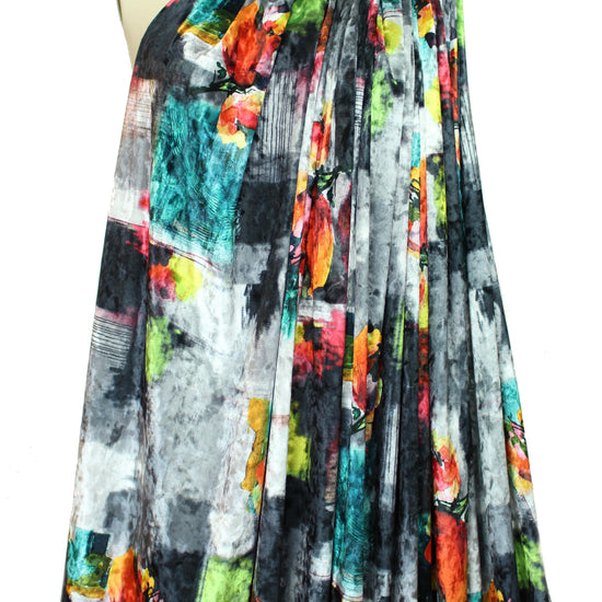 This is a gorgeous stretch velvet, lightweight with a liquid drape, and luxuriously soft hand, a beautiful sheen and about 60% crosswise stretch. The stunning painterly abstract flowers print has a 24" repeat and features shades of silver and gray, vivid orange spice tones, turquoise and teal, rouge, black and touches of lime (PANTONE 14-4002, 18-1550, 18-5610, 13-0442, etc.). Make a top, tee, tunic, dress, skirt, shirt, etc. for day or evening! Hand wash and hang to dry. LAST PIECE, 1.5 yds.