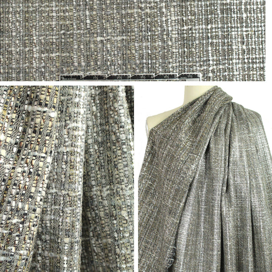 From Italy, this is a beautiful fancy weave tweed suiting in earthy grays and browns, glazed lightly on one side with a silvery metallic in a very subtle grid design (PANTONE 17-1410, 16-1407, 18-0306, etc.). It is gorgeous quality, so luxuriously soft with some body in the drape. Classic and sophisticated with a modern touch, it is a medium suiting weight that is perfect for tailored jackets, topper coats, suiting, skirt, sheath dress, etc. The reverse is the same, without the silvery glaze, so either side could be used as the face, with the reverse as contrast. It is a versatile all-occasion beauty. Dry cleaning recommended. 2.25 yds.