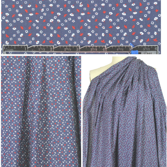 This is a charming cotton poplin woven made in Italy, a shirting weight with a very dry hand and smooth surface texture. It is light weight, almost opaque, with a cottony crisp drape. The print is a teeny graphic floral in red, white and blue (PANTONE 17-1654, 19-4014). Perfect for a shirt or top, tunic, casual dress, skirt, etc. Hand wash, hang to dry, medium iron. (Machine wash gentle is probably fine but please test first.)