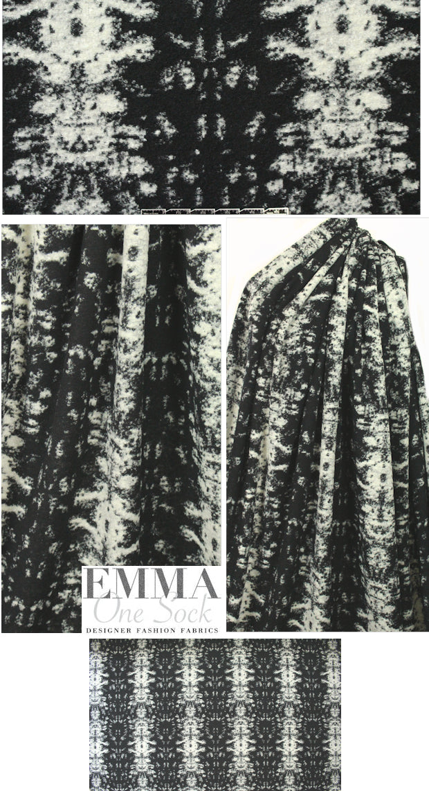 From a NY designer, and made in Italy, this lovely wool blend sweater knit has a yarn-dyed edgy rorschach design in black and winter white with a 15" vertical, 11" horizontal repeat. It is medium weight and opaque, with about 30% widthwise stretch. The yarn-dyed pattern appears on both sides, but the face has a brushed ottoman texture, while the reverse is more of a flat weave. It is a versatile and cozy sweater knit with a more firm drape, perfect for a cardigan, top, tunic, hoodie, sweater dress or skirt, etc. A single layer pattern layout is recommended to get your pattern placement just right. Test first if you wish to hand wash and lay flat to dry, or dry clean. 1.75 yds.