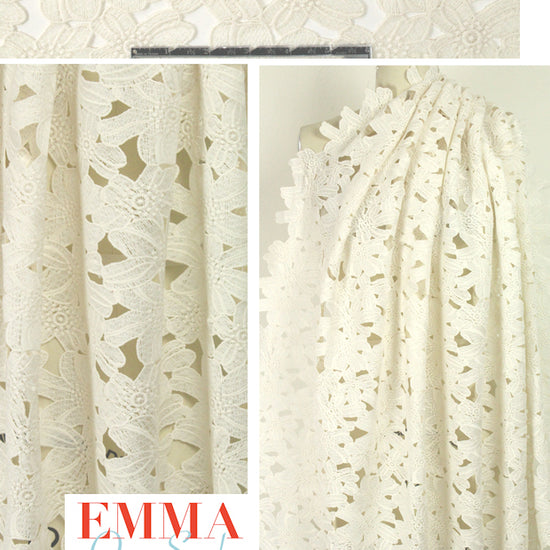 From a CA designer, this is an exquisite Italian guipure lace in a pretty ivory (PANTONE 11-0606) with some "sheeny" fibers that give it a subtle glazed look (much more noticeable on the black lace than the ivory). It has gorgeous scalloped borders along both selvages, drape with body, and is photographed on a white background to show the openness of the weave. Best for a special occasion garment---anything that calls for guipure lace. Stunning! Dry-cleaning recommended. 1.5 yds.